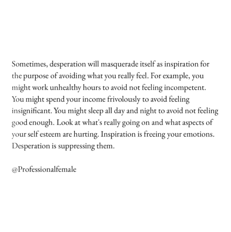 Inspiration is freeing your emotions. Desperation is suppressing them. When you’ve spent your day sleeping or in essence, not using your time wisely, (this includes over browsing the internet, not showing up on time, over dieting or even overworking), deep inside you are avoiding your emotions of not feeling good enough, not feeling important, not feeling safe etc.